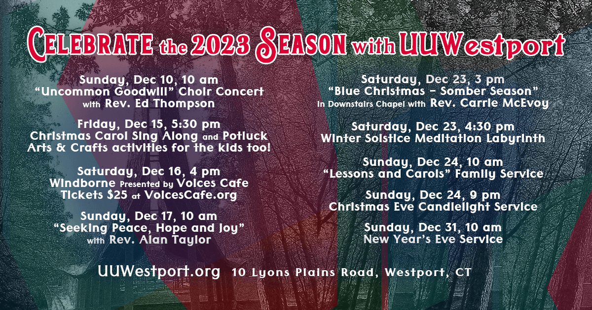 If you want to celebrate Christmas Eve at UU Westport with children and the 9:00 PM gathering is simply too late, join us on December 24th at 10:00 AM. I will lead a fun and engaging multi-generational service with carols and lessons of the season!